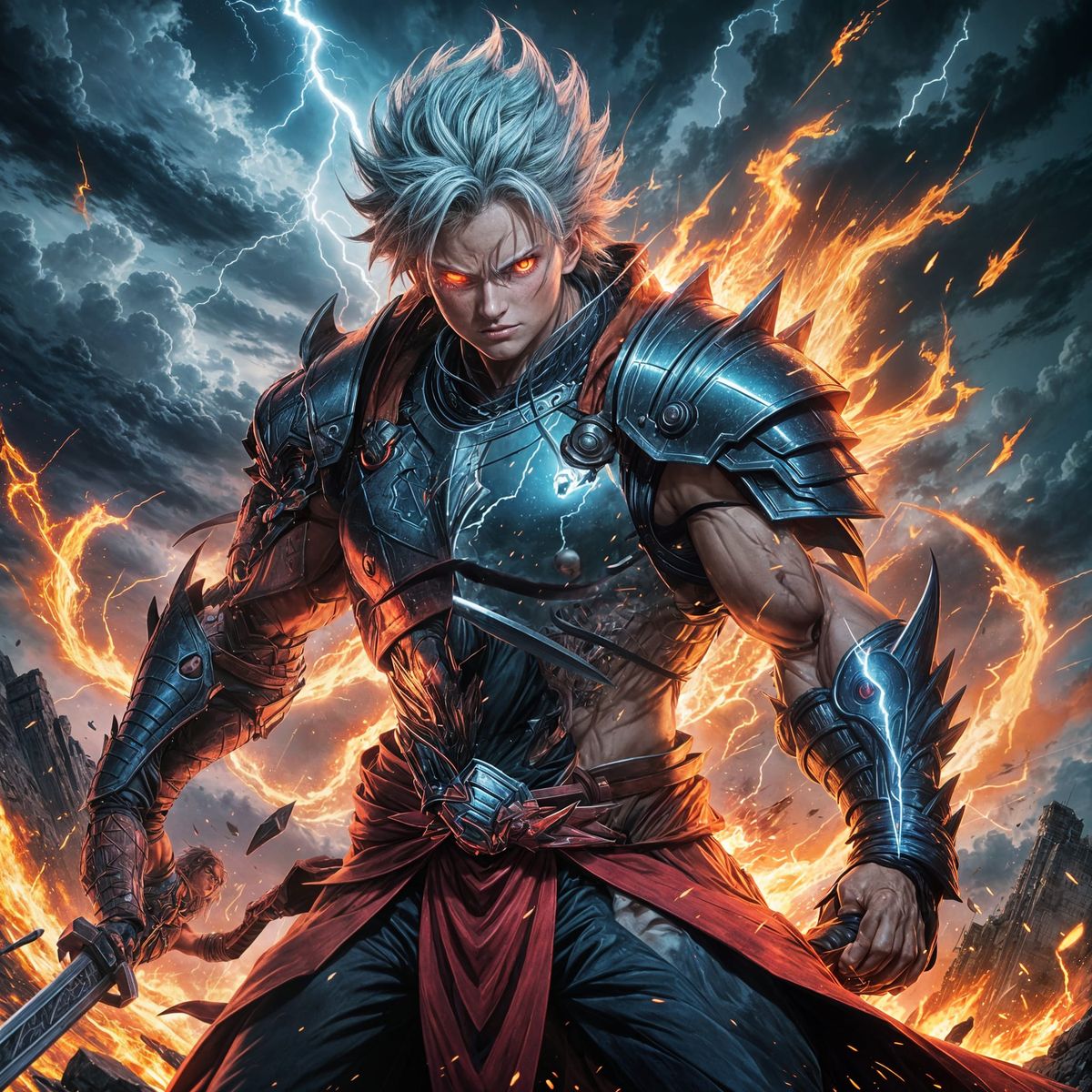This dynamic anime artwork depicts a powerful warrior standing on a shattered battlefield, wielding an enchanted katana and surrounded by intense magical energy and a dramatic clash of dragons. With vibrant, flat colors and cinematic lighting, this masterpiece showcases a thrilling, exaggerated manga sty...