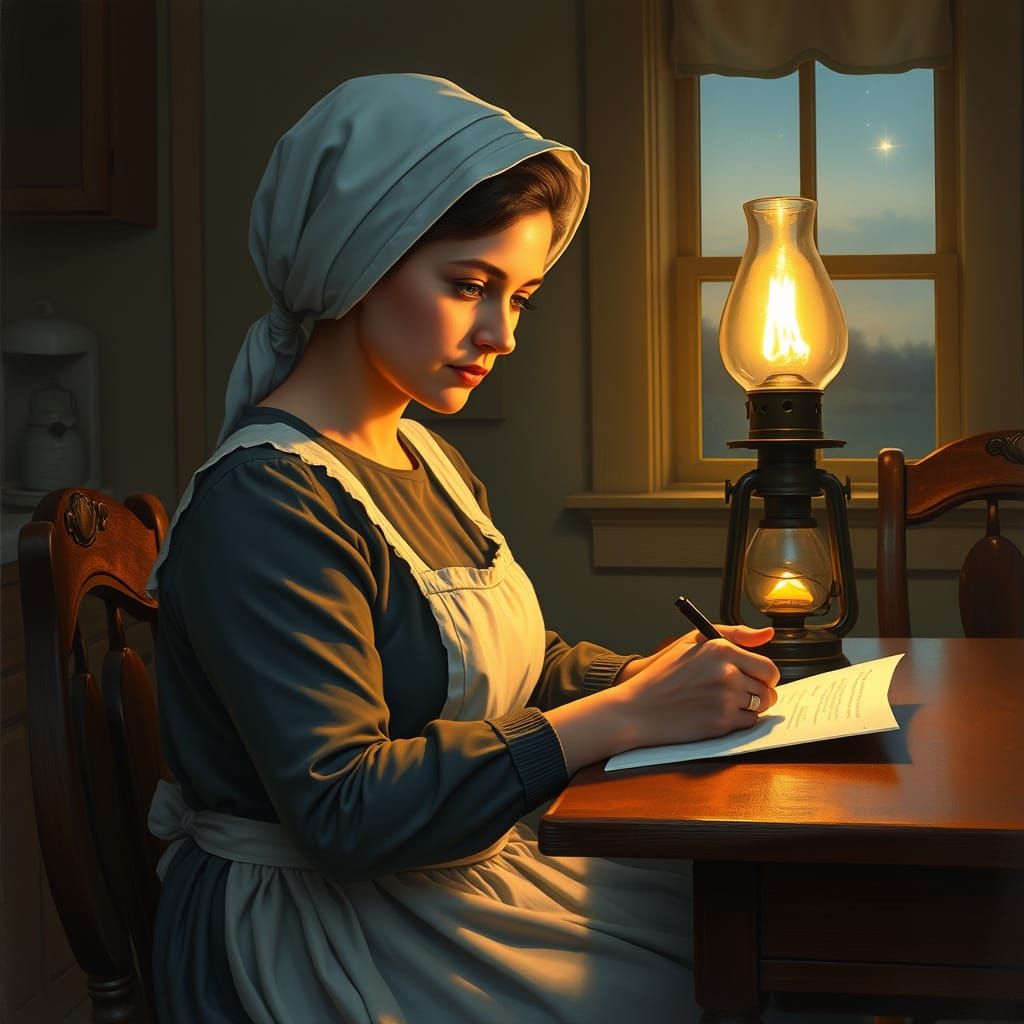 This image shows a tranquil Amish woman sitting at her kitchen table, surrounded by the soft glow of a kerosene lamp and the evening star outside. Rendered in a serene, photorealistic style, the scene conveys a sense of quiet contemplation and simplicity.