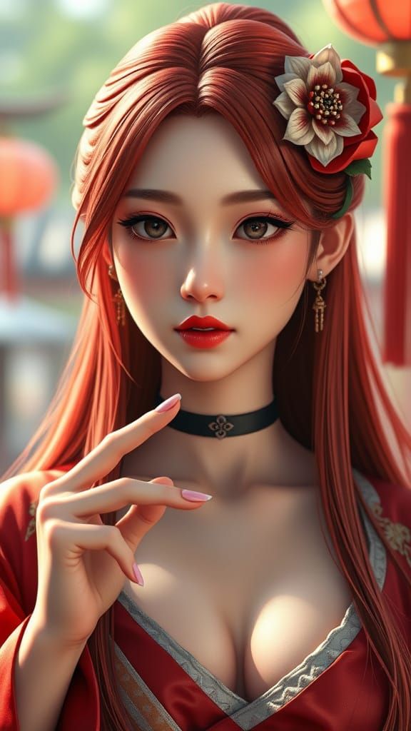 This image showcases a beautiful, long-haired girl with striking red locks, intricate makeup, and a vibrant choker. Rendered in ultra-high resolution with realistic, professional lighting, the portrait exudes a sense of dynamism and beauty.