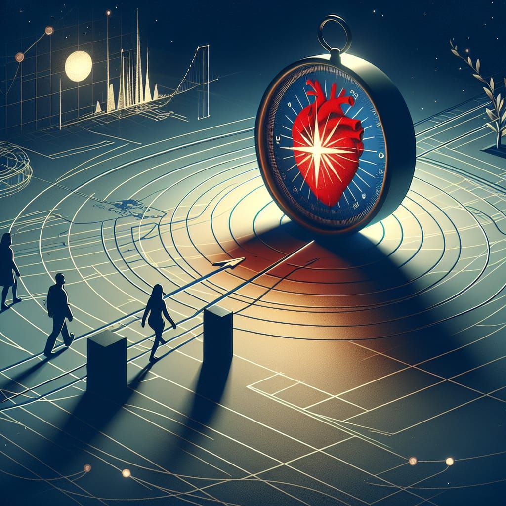 This image shows an abstract representation of the emotional journey of searching for love. The scene depicts different locations and uses a heart-shaped compass to symbolize instinct.