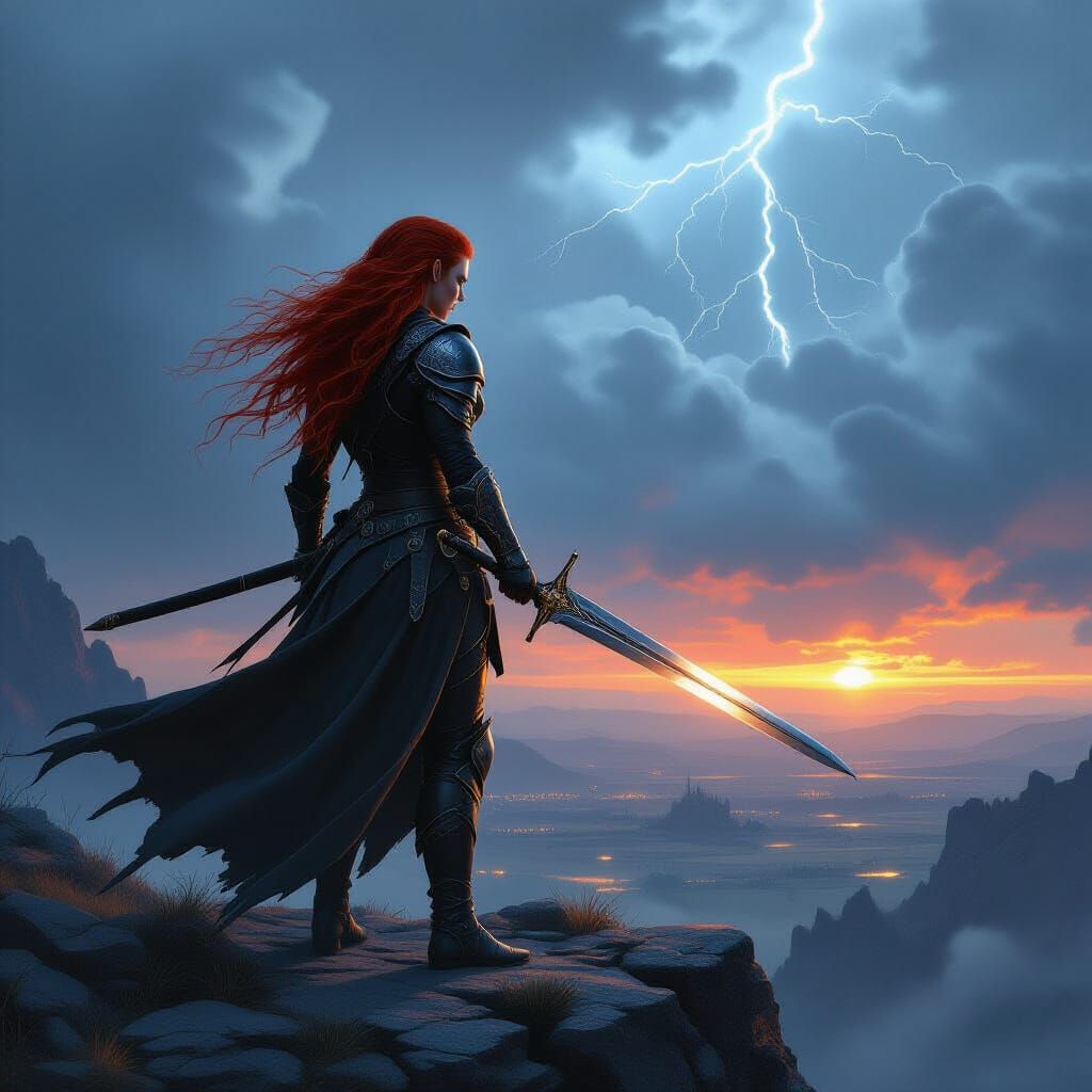 A cinematic image of a red-haired elven warrior on a cliff, overlooking a battlefield. The scene features dark clouds, lightning, and deep colors, in a detailed matte painting with a film aesthetic.
