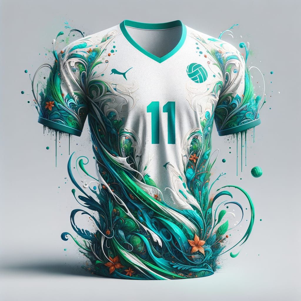 This image showcases a white volleyball jersey featuring dynamic turquoise green accents. Crafted as an intricate matte painting, it displays deep, complementary colors and fantastical concept art elements, reminiscent of high-detail fantasy artwork.