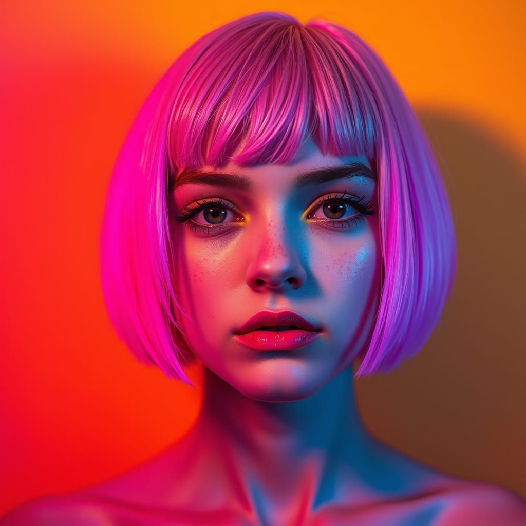 A digital portrait of a young woman with a pastel pink bob and freckles. The image features soft lighting and a vibrant color palette in a dreamy, melancholic aesthetic.