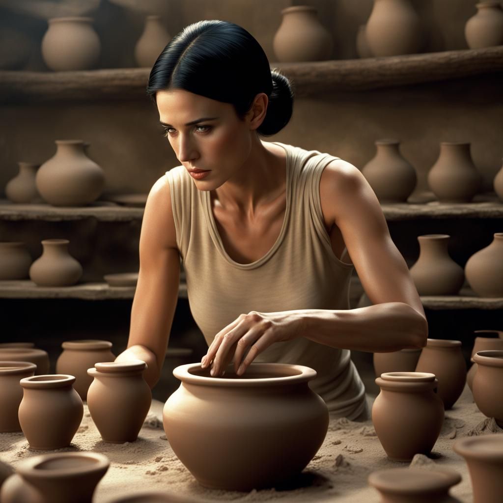 A digital painting of a young Demi Moore crafting pottery. The scene evokes a cinematic and atmospheric feel, with meticulous details and a maximalist aesthetic.