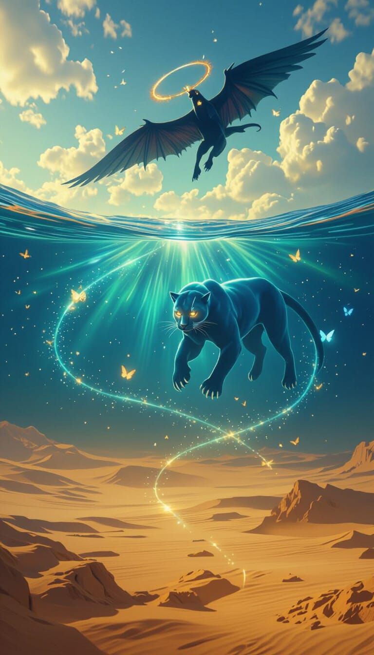 A striking picture of a crystal panther with radiant aurora wings traversing a cliff under a starlit sky. Its serpentine tail morphs into light butterflies in this surreal, dreamlike scene as 3D rendered digital art.