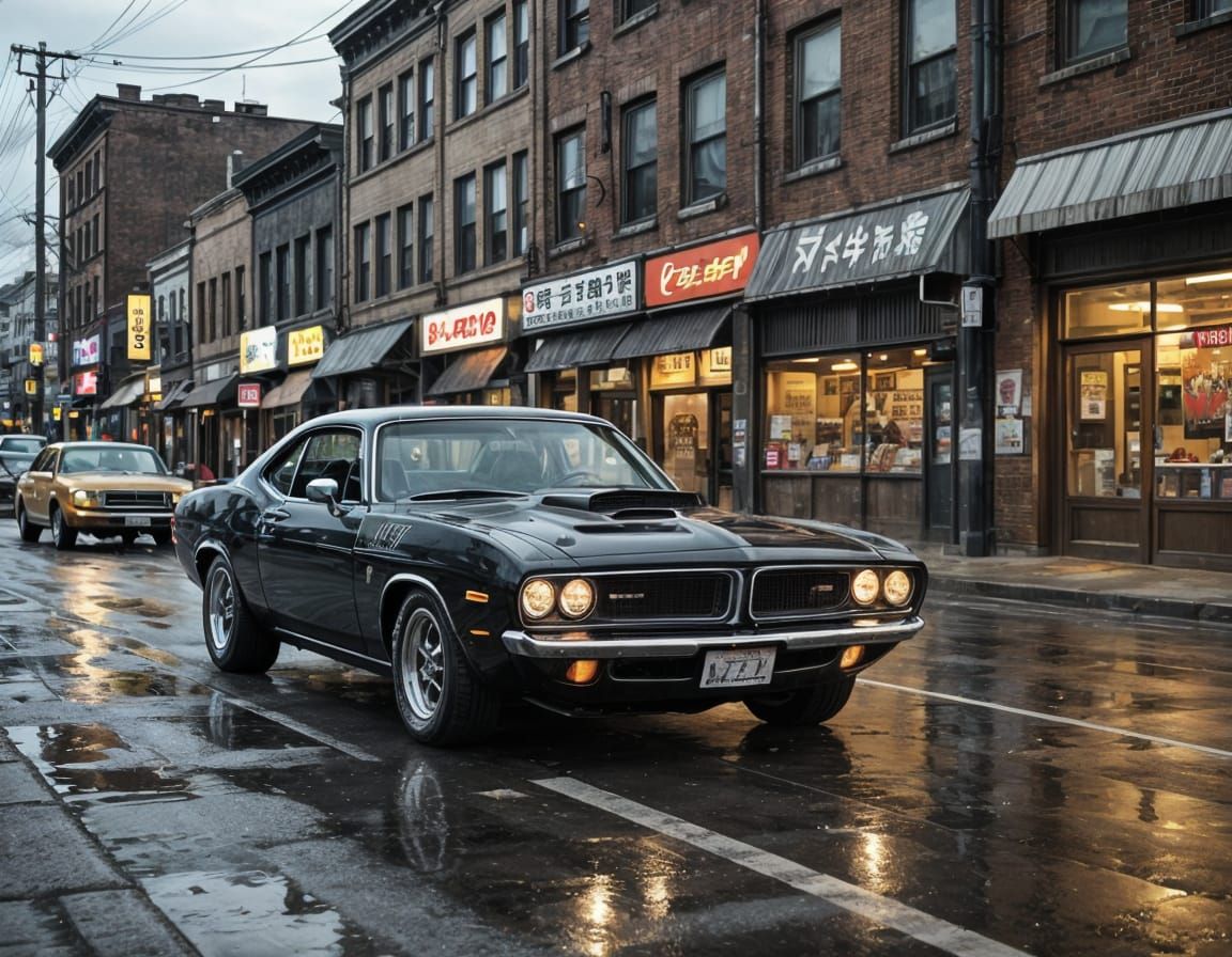 A tuned 1970 Plymouth Barracuda speeds down a wet Detroit street. The matte black car features a low chassis and tuned rims, set against a gloomy, simplified backdrop in a Japanese anime style.