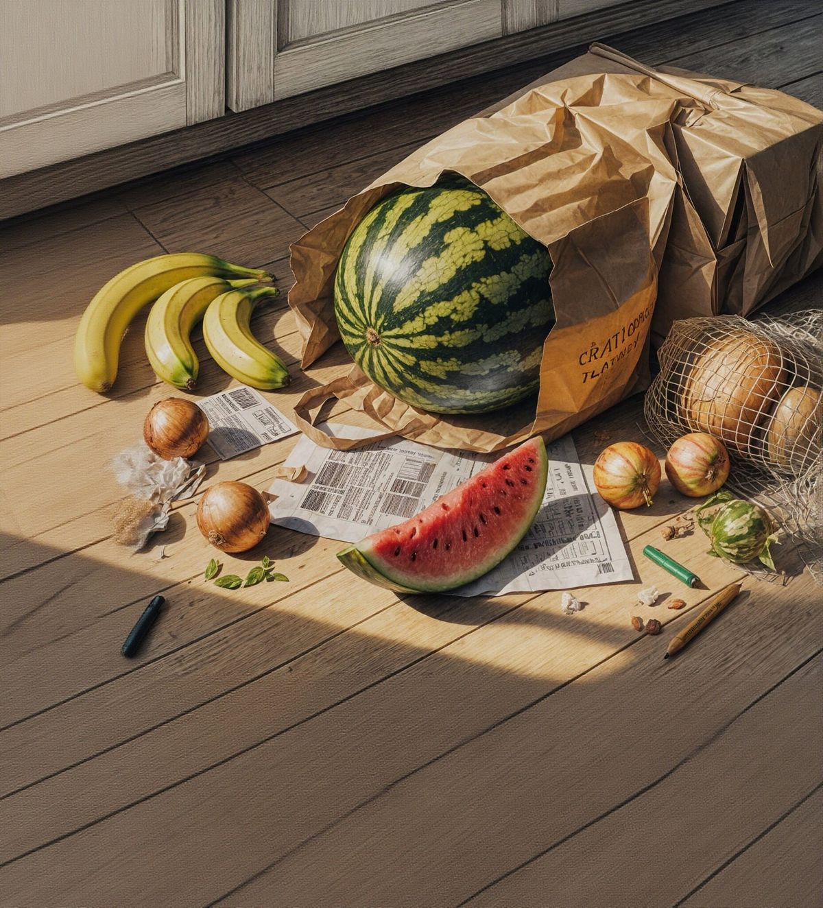 A realistic still life of groceries scattered on a kitchen floor. A watermelon protrudes from a collapsed brown bag, surrounded by bananas, onions, and a receipt. The scene is lit by natural daylight creating strong shadows, rendered with drawn textures in colored pencil and ballpoint ink.