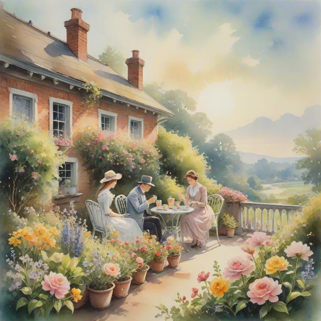 This image shows a Victorian couple enjoying tea in their garden. The watercolor painting style is defined by soft pastel colors, gentle textures, and a warm, serene atmosphere.