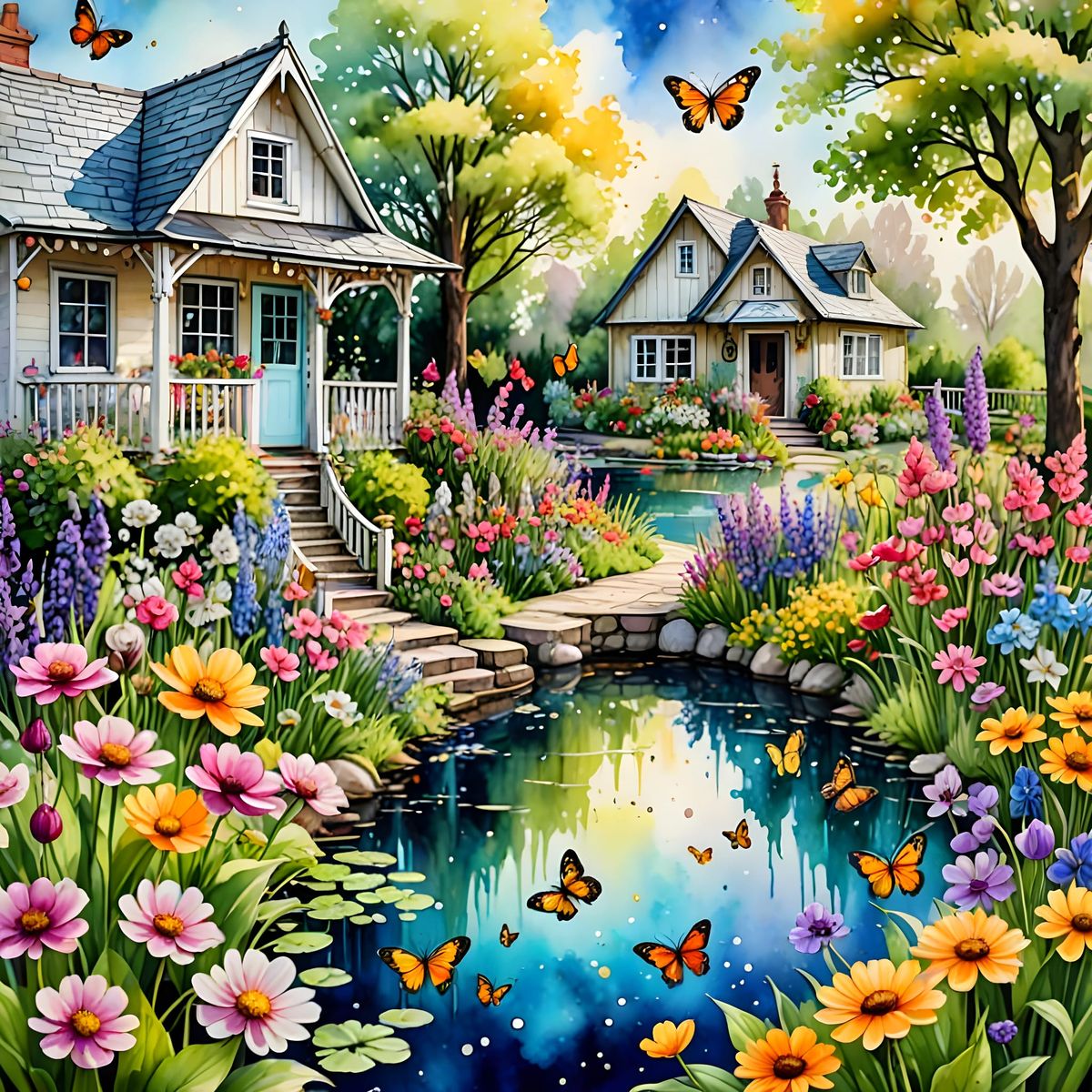 This serene image depicts a picturesque cottage surrounded by a lush spring garden, teeming with colorful blooms, butterflies, and a tranquil pond, rendered in a vibrant, abstract art style with complementary colors and fine details.