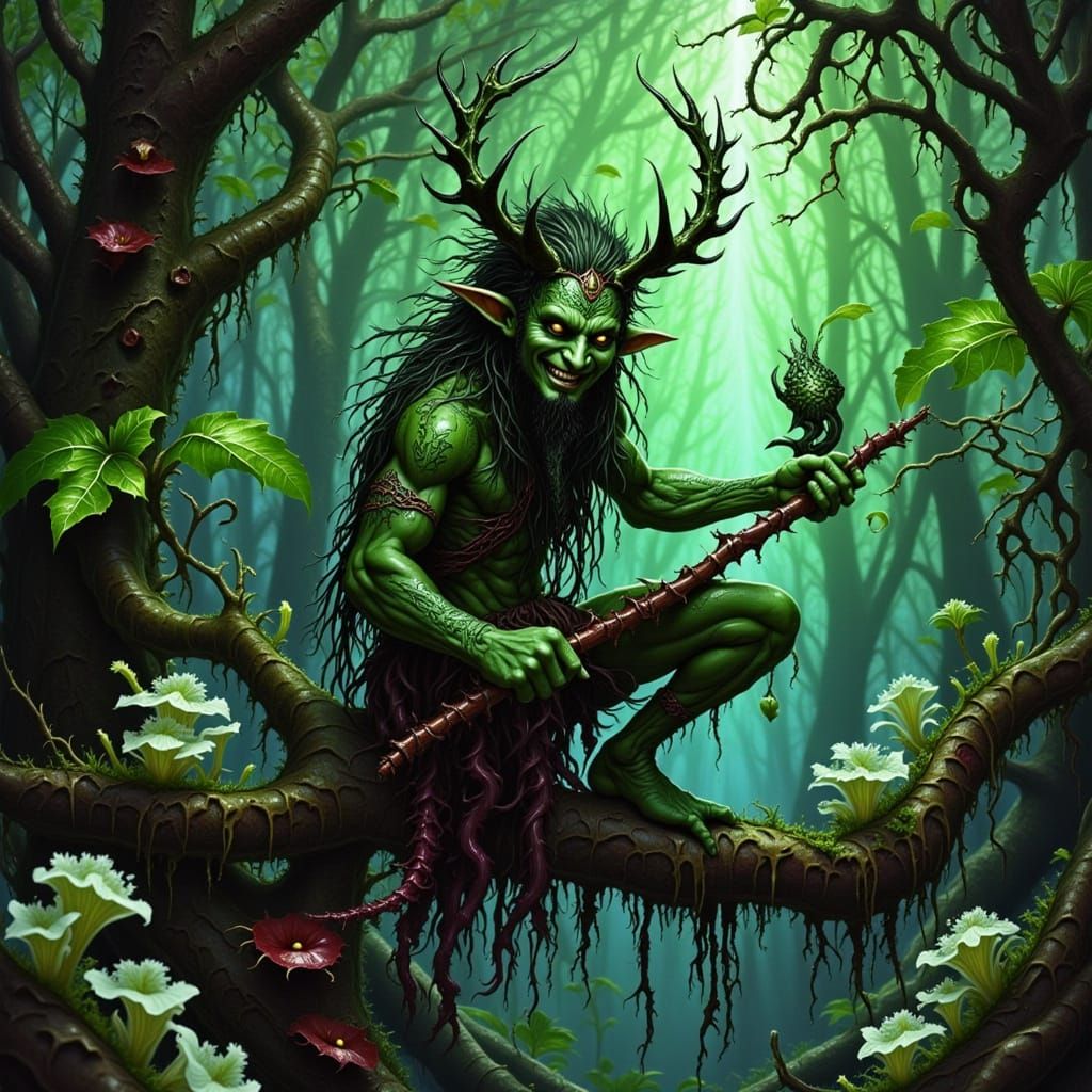 A dark fantasy illustration of Varik Thornweaver on a twisted root, with glowing spores and a moss green, bronze, and red palette. The art style evokes classic dark fantasy.