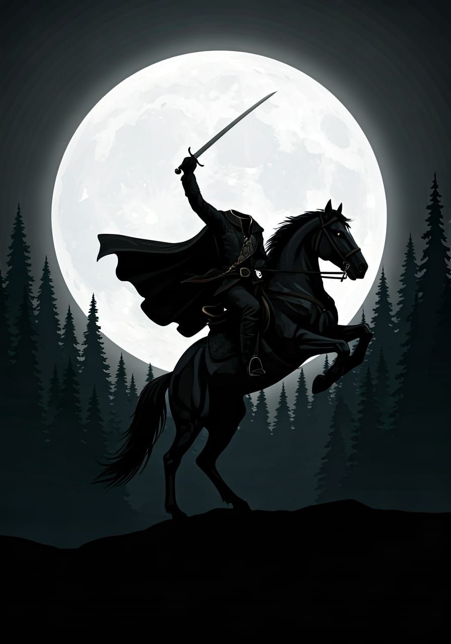 This image depicts a headless horseman with a flowing cape and raised sword, galloping through a dark forest beneath a large full moon. Features a cinematic horror silhouette style.