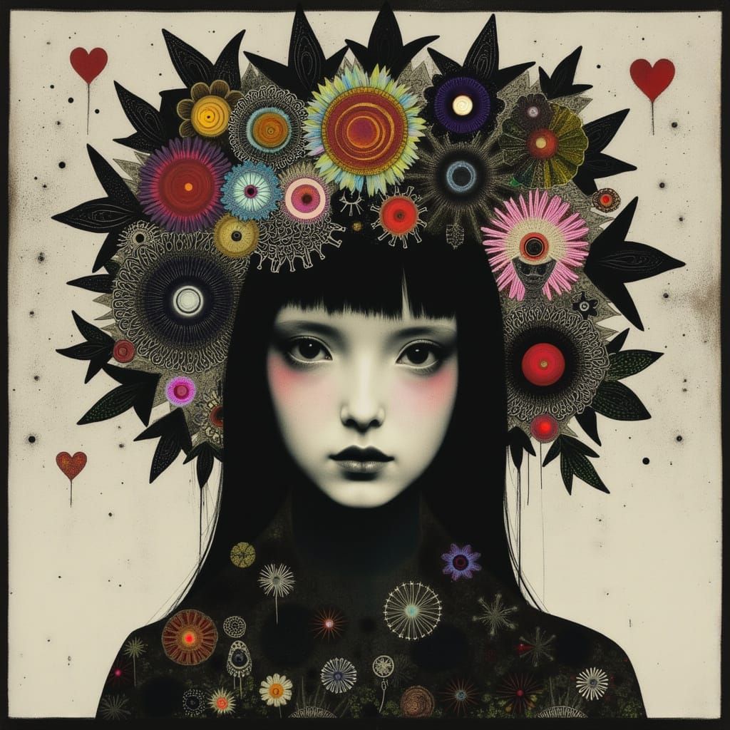 This image depicts an ethereal woman symbolizing isolation and introspection, rendered in a detailed, gothic paper-cutting aesthetic with floral and heart elements.