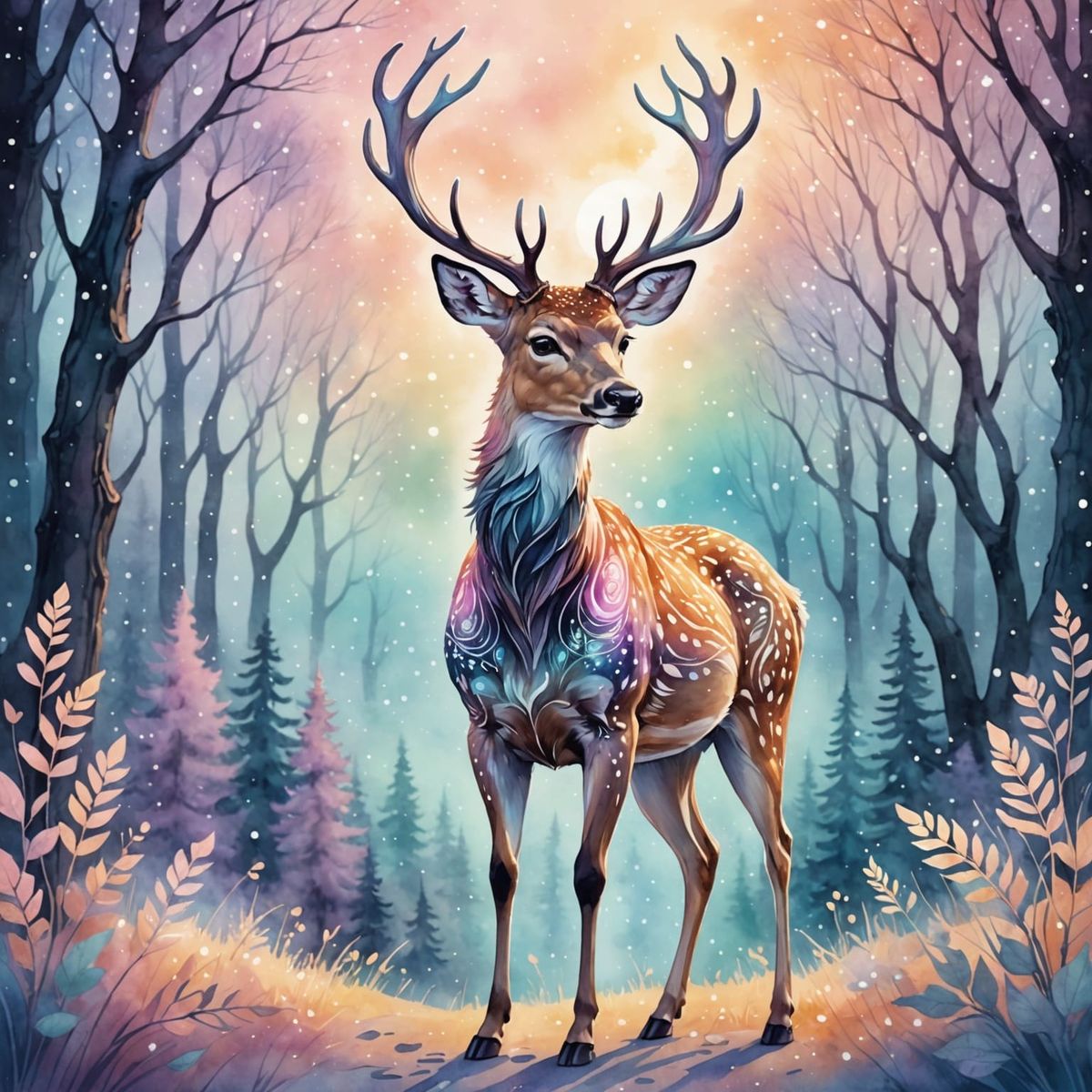 A stunning image of a stardust deer in a dreamy landscape. Showcasing soft lighting and pastel colors with intricate patterns, the image evokes a light and airy fantasy concept.