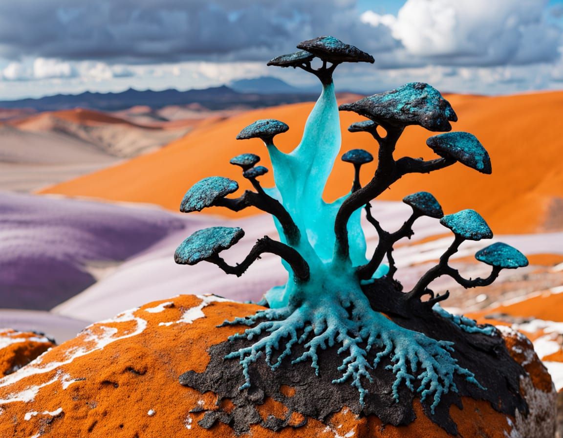 Animal exotique extraterrestre rampant sur un désert glacé surréaliste aux dunes en noir et blanc striées comme des vagues sonores. Deux entités contrastées apparaissent :
