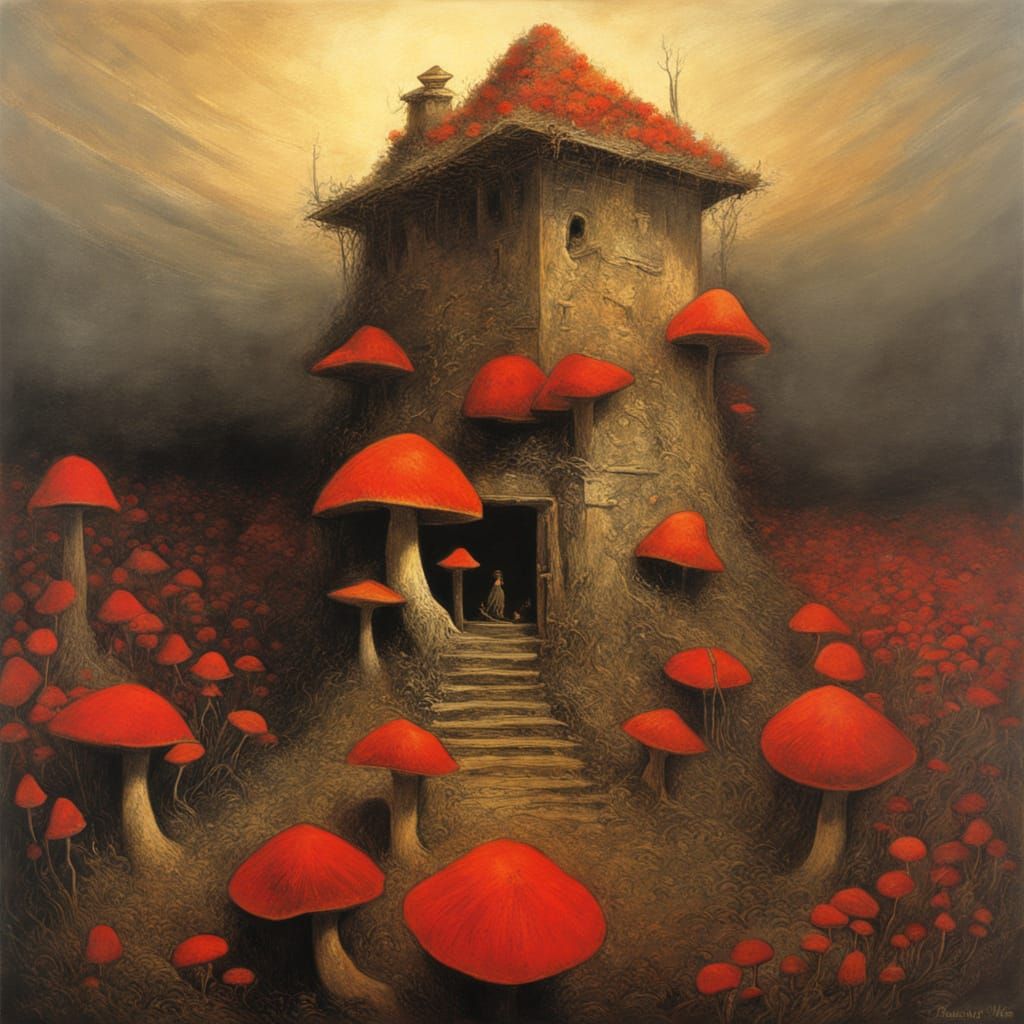 A whimsical scene of a birdhouse nestled among vibrant red mushrooms. This artwork evokes a dreamy, romantic ambiance through the use of watercolor techniques and a luminous, backlit effect.