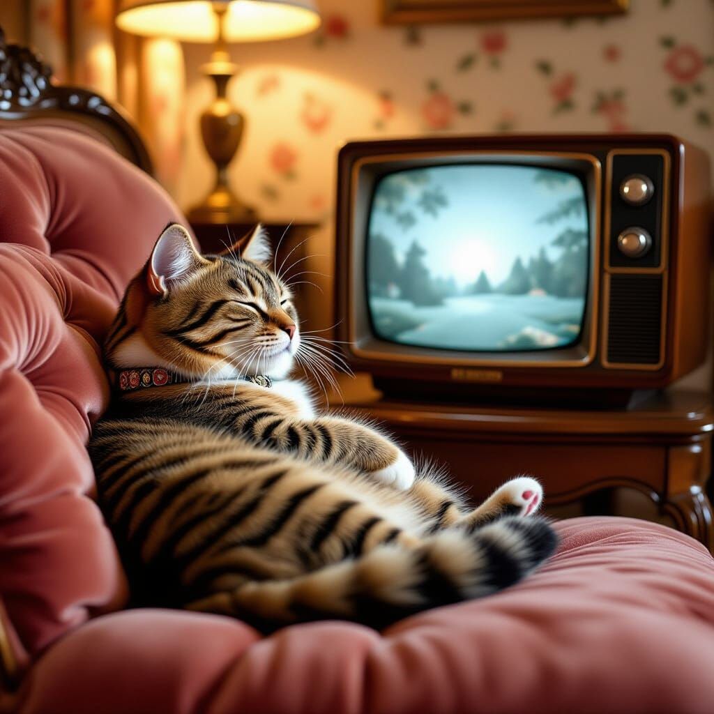 This image shows a tabby cat sleeping on a sofa. The cat is watching an old movie on television, with soft lighting and textures in a whimsical style.