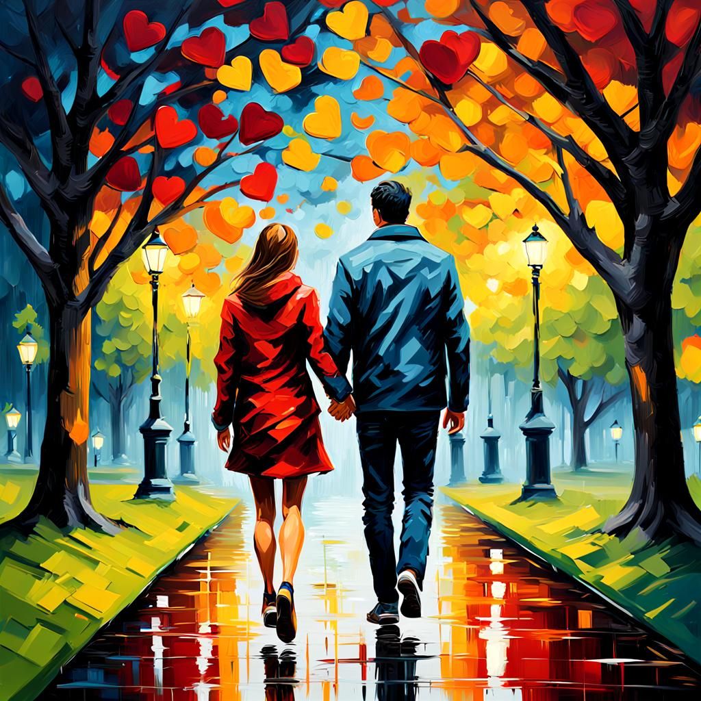 This image shows an impressionistic oil painting of a couple walking hand in hand in a park at night. The artwork employs dynamic lighting and triadic colors.