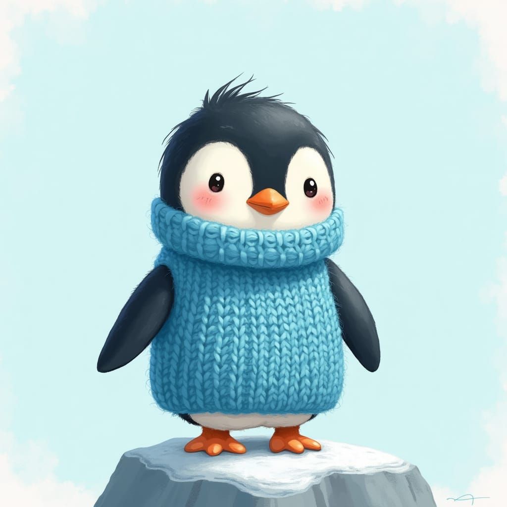 This image shows a cute penguin wearing a blue sweater, standing on icy rocks. The illustration has a whimsical feel with great attention to detail and a playful style.