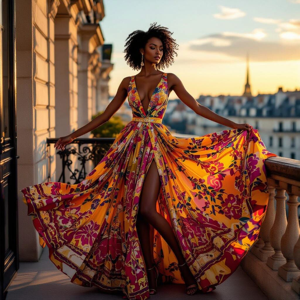 This image captures a medium shot of a confident Black woman in a vibrant, embroidered dress posing dynamically on a Parisian balcony during golden hour. Cinematic lighting creates high contrast and dramatic shadows.