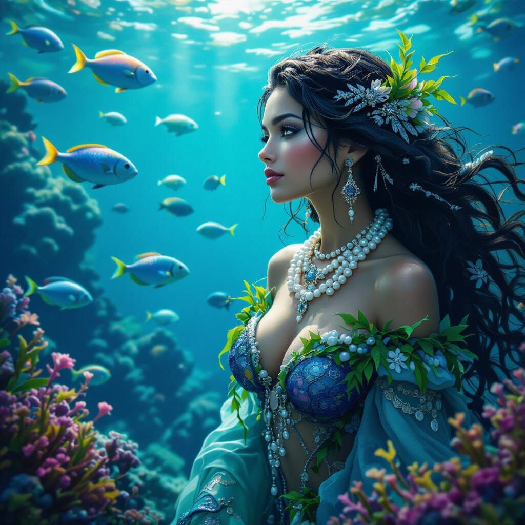 This image shows a mermaid adorned with pearl jewelry, amidst colorful fish and marine flora. The artwork evokes fantasy concept art with detailed textures and a rich palette of blues, greens, and vibrant accents.