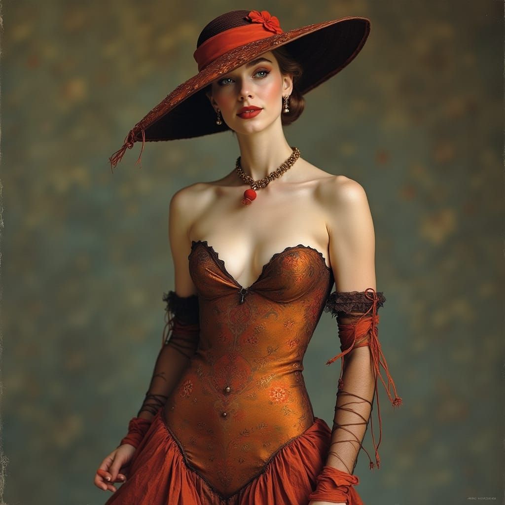 This image features a woman dressed in unique, avant-garde clothing. The design evokes the artistic style and influences of Modigliani, presented as a realistic photograph.