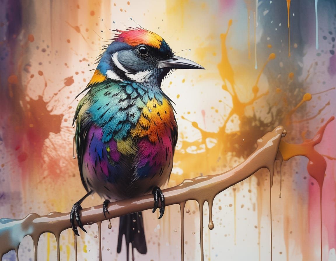 This image showcases a close-up, detailed illustration of a small, wet bird with vibrant plumage. The artwork features an expressive ink and watercolor wash style with a colorful, graffiti-infused background.
