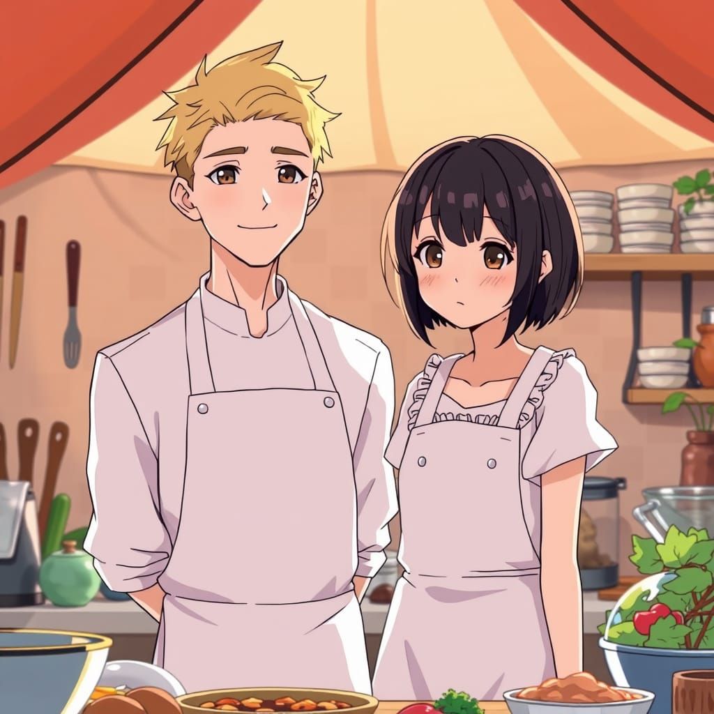 This image shows two youthful figures, one a blond male chef and the other a black-haired anime-style girl, in a sunlit tent kitchen filled with cooking utensils. The image is reminiscent of anime art.