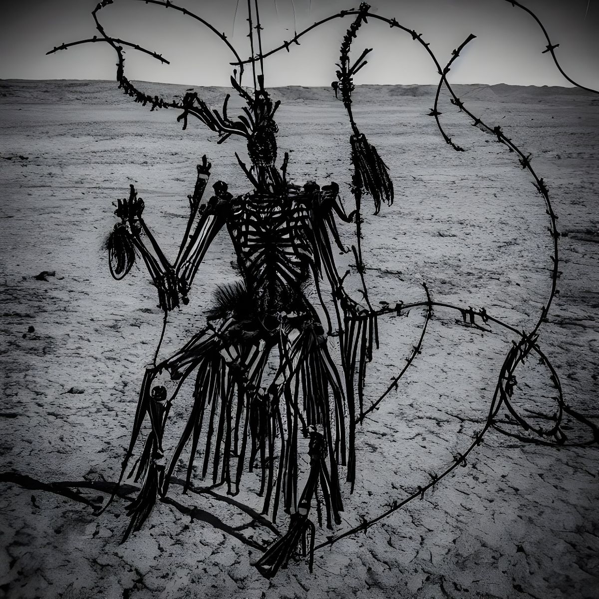 A striking picture of a skeletal creature adorned with feathers and barbed wire in a dystopian alien setting. This image captures an otherworldly expedition encounter.