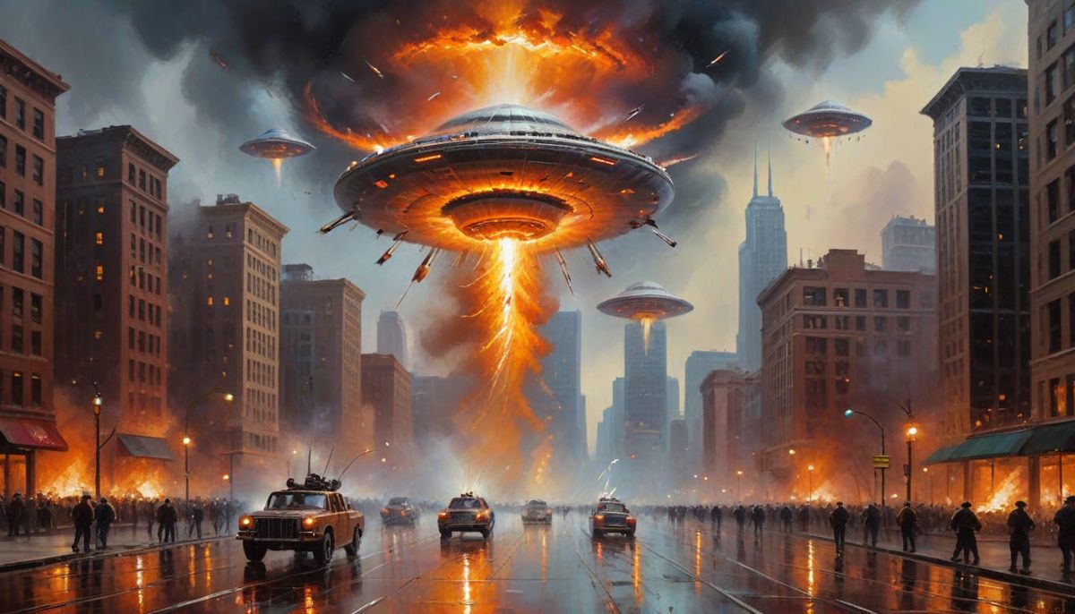 This image shows a chaotic scene of UFOs attacking Chicago, rendered as an impasto oil painting. The artwork captures the essence of war with fire, smoke, and vivid colors.
