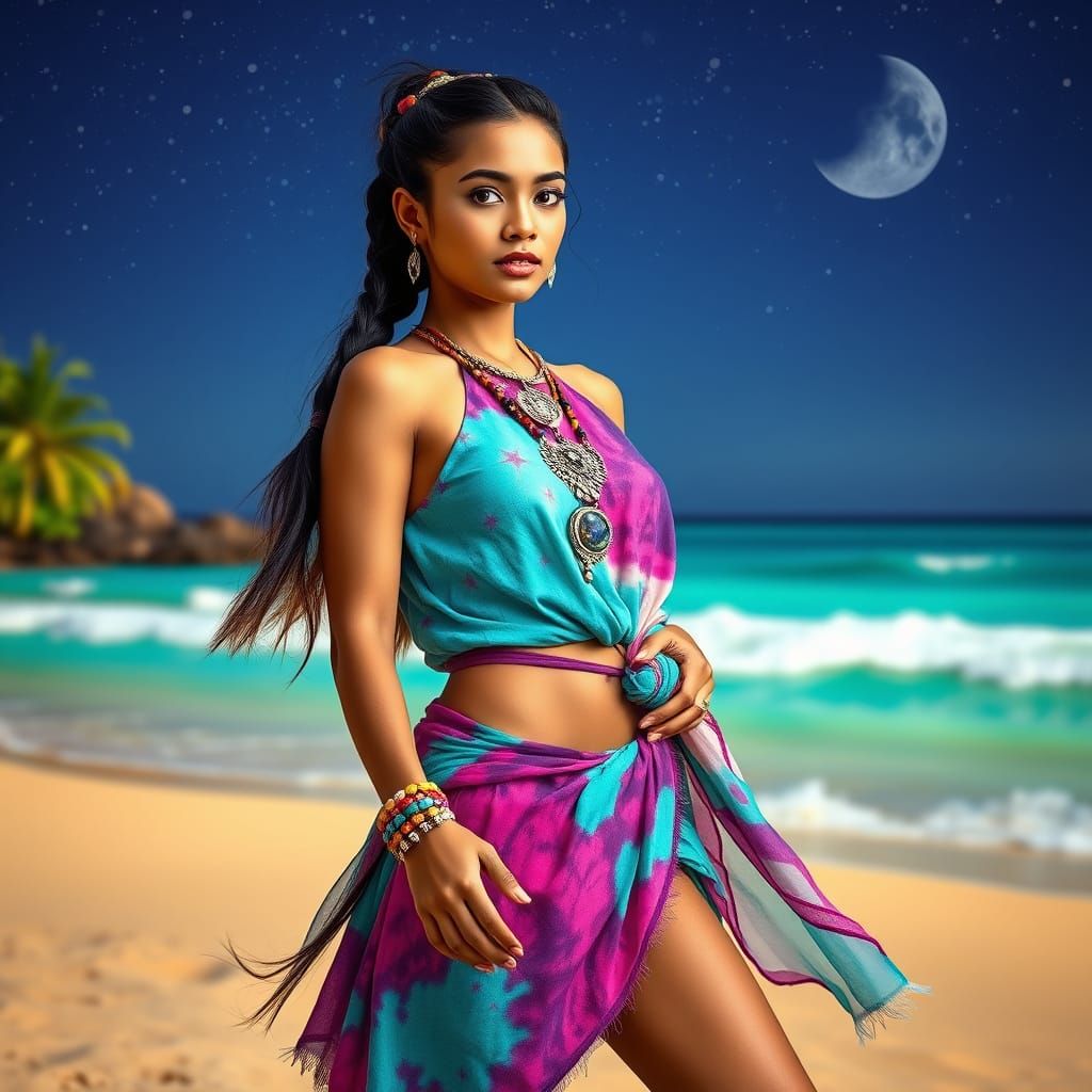 This image shows a slender Burmese woman on a tropical beach, confidently posing in bohemian-style attire. The vibrant clothing and ornate jewelry complement the scene's celestial and cosmic motifs.