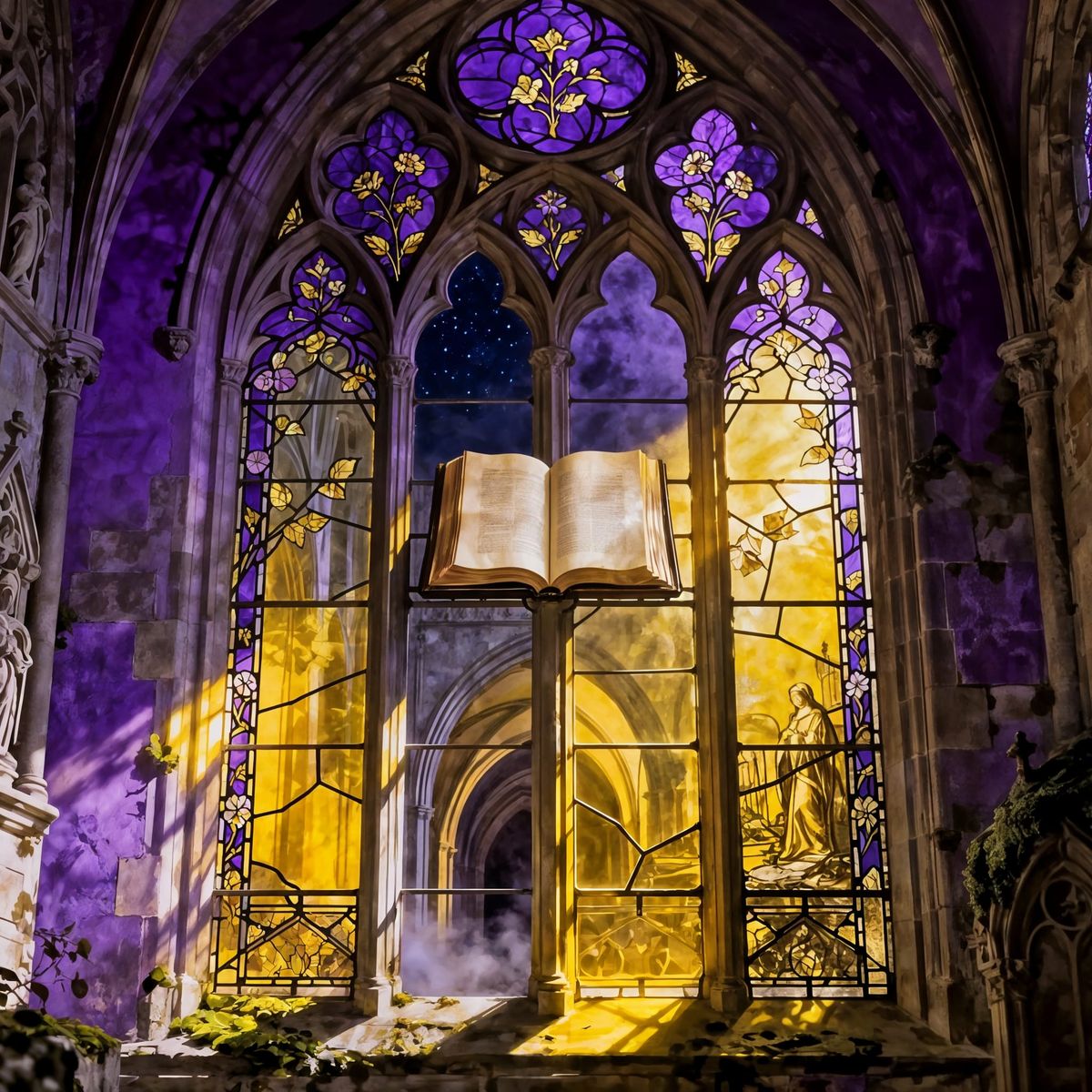 This image features an ornate gothic stained glass window depicting an open book. The artwork uses violet and transparent yellow, set against a night-draped church wall.