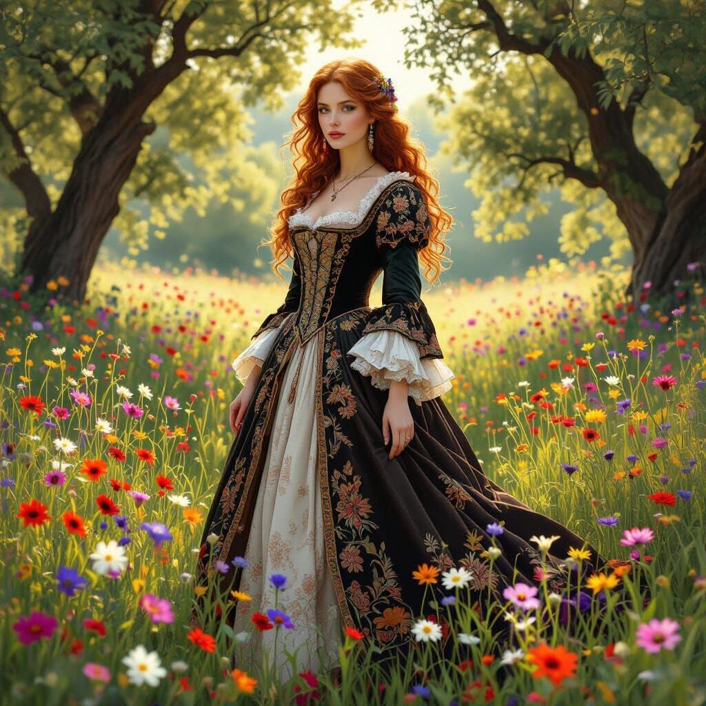 A striking picture of a Renaissance-era woman in a wildflower field. The hyperrealistic digital illustration shows her in an embroidered gown, bathed in soft sunlight, reminiscent of pre-Raphaelite paintings.