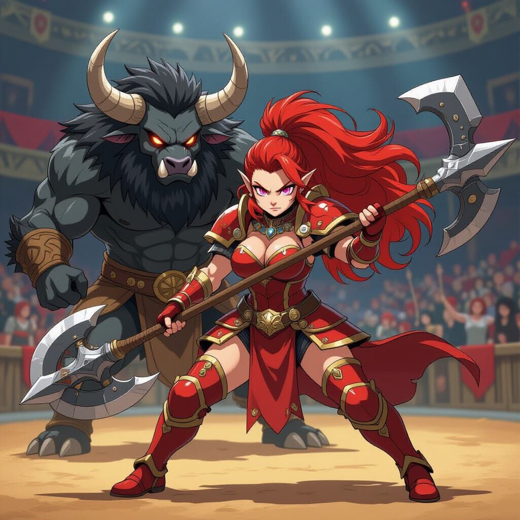 This image shows a fierce dwarf warrior maiden with a red aura, wielding a greataxe. She strategically outmaneuvers a towering minotaur in a gladiator arena, depicted with cel-shaded textures in a vibrant manga style.