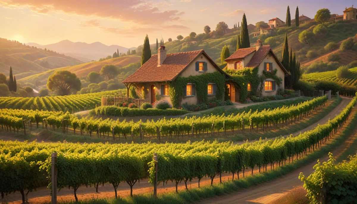 This idyllic pointillism painting depicts a serene Tuscan-inspired Napa Valley scene, featuring a charming cottage surrounded by lush vineyards and rolling hills, bathed in warm golden light and inviting atmosphere.