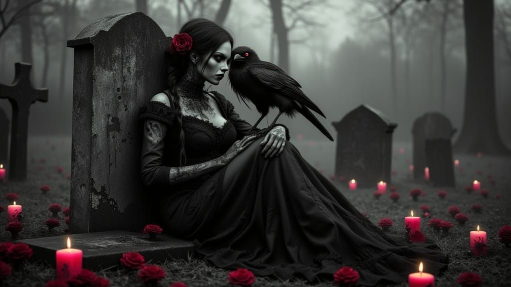 Black, white, and red. A victorian gothic, slightly decaying female zombie <lora:Zombies1:1.0> with long black updo hair with a rose, wearing a black victorian dress with roses, sits beautifully in a cemetery leaning her back against a tombstone. A raven stands on her chest resting its head against hers. ...