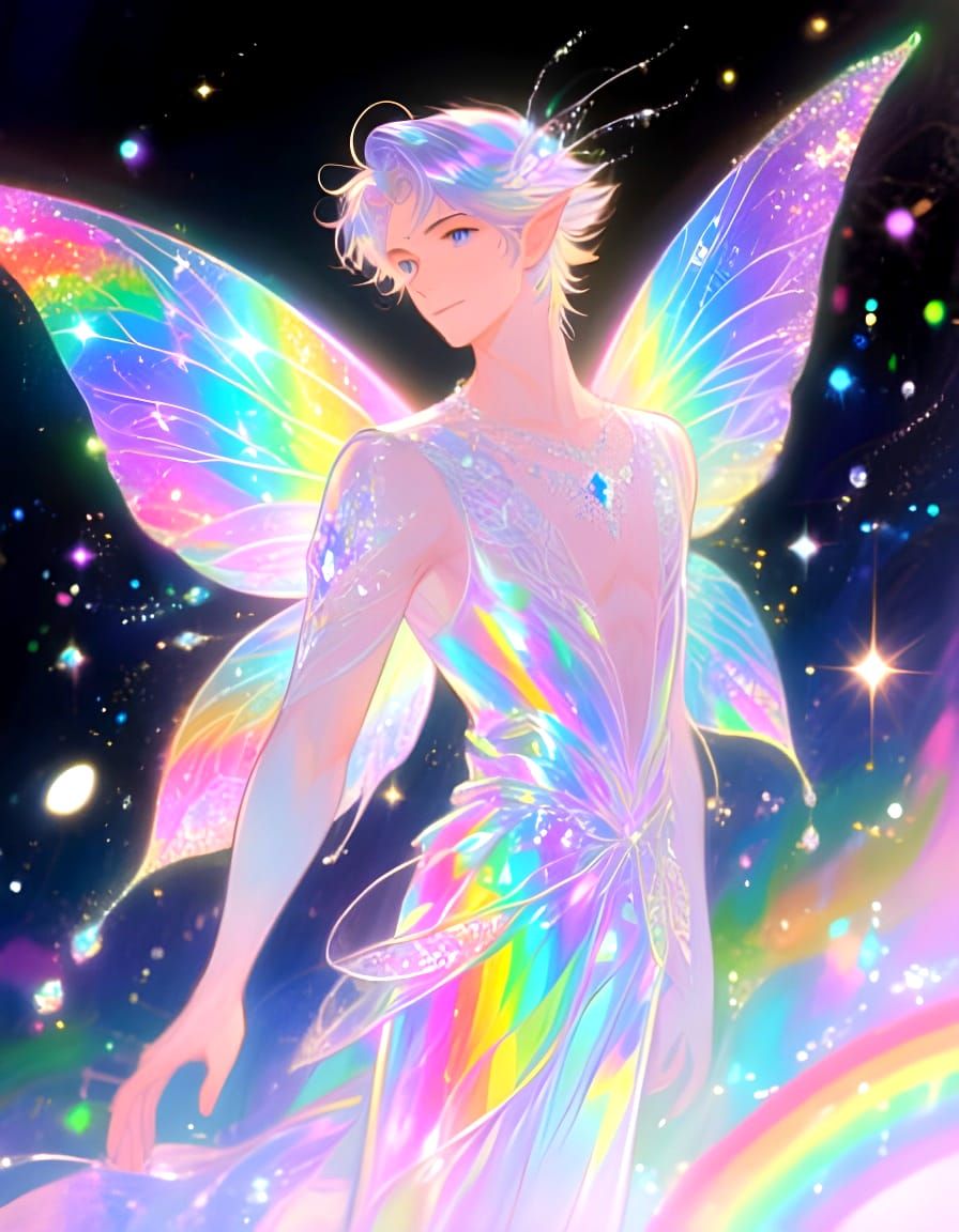 A beautiful, fragile male fairy with a magical aura, rendered in shimmering holographic colors and sparkling light points. Features intricate details and luminous reflections.