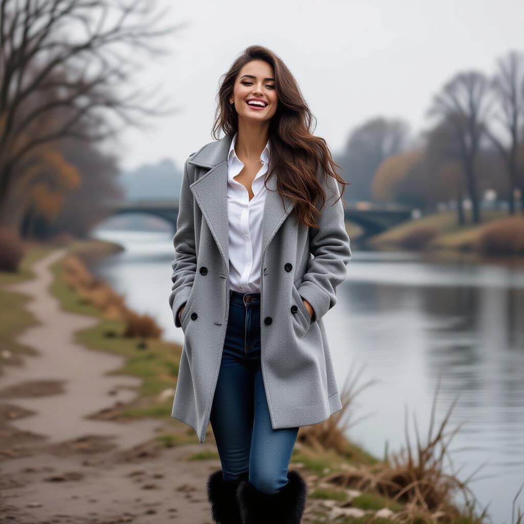 A hyperrealistic portrait of a laughing woman in a coat, jeans, shirt and boots, set against a serene river landscape. The image is high detail digital art.