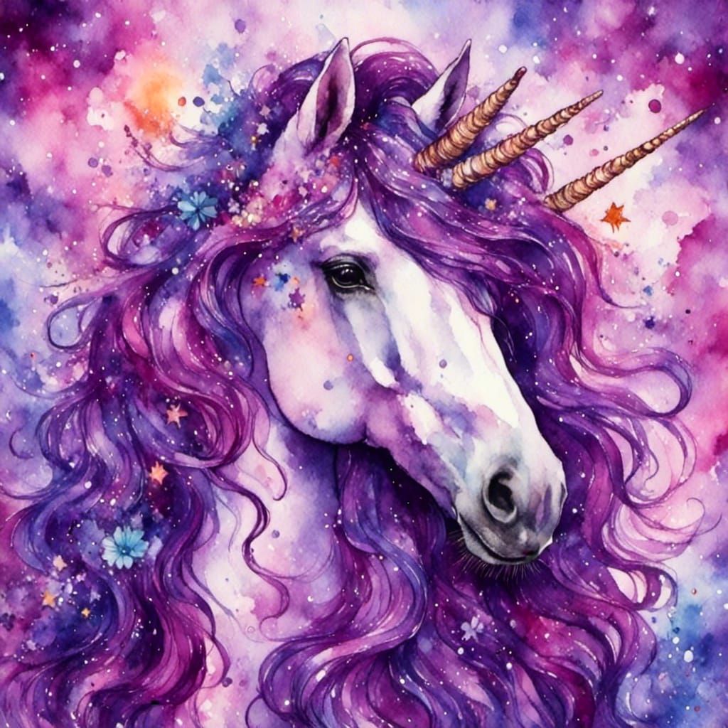This image shows a purple unicorn with three horns. The artwork features watercolor fantasy elements and pearl accents in an epic splash style.