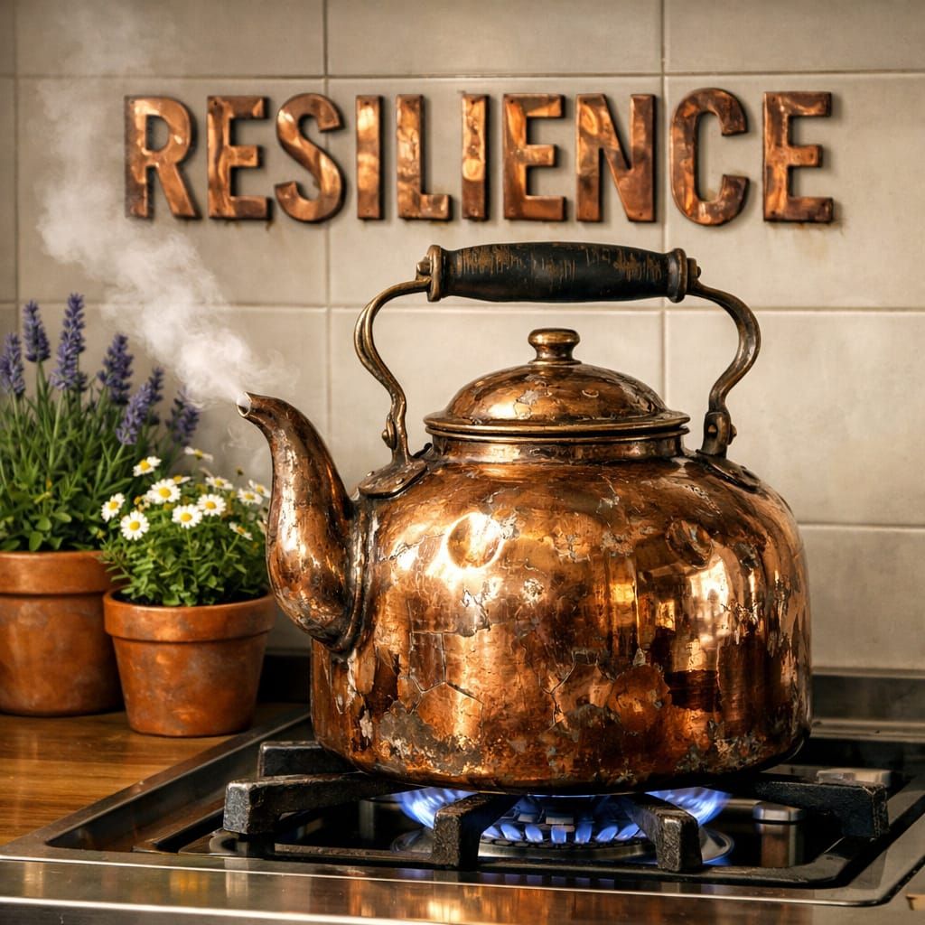 A random word generator gave me "resilience," "growth," "kettle," and "Geneva." Probably not much Swiss influence in this picture, but I tried to get the other concepts in there.