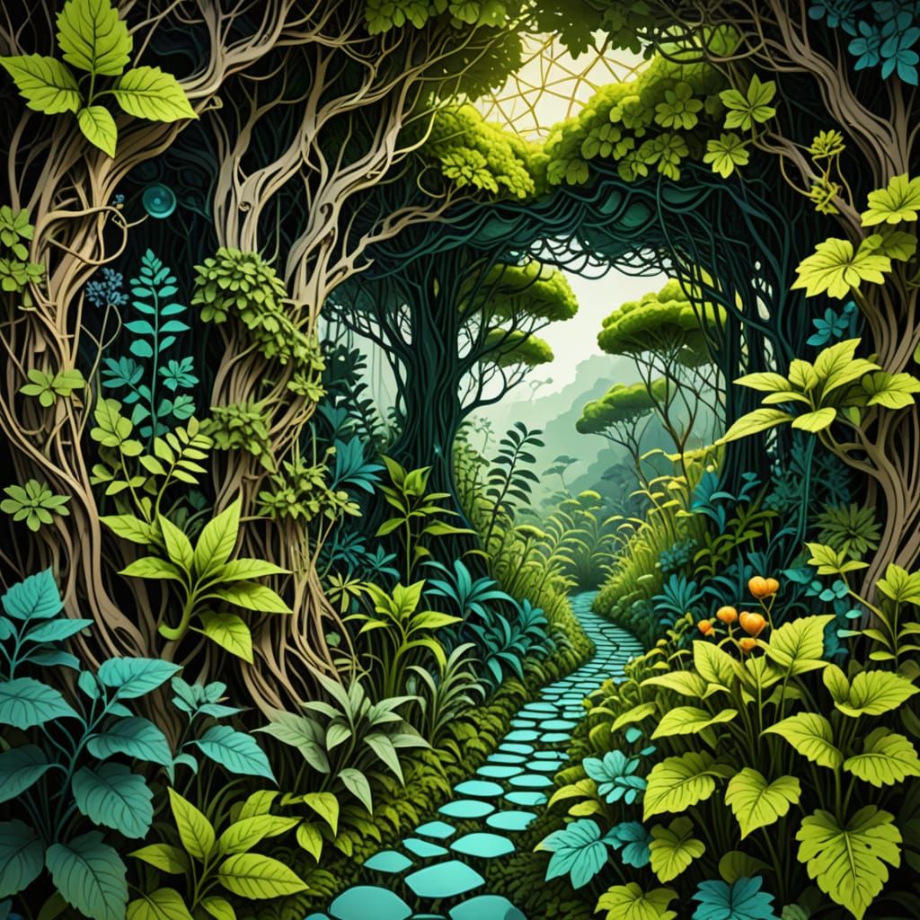 This image shows a hidden garden cultivating deadly herbs and toxins. The grid-based design features color cycling and abstract fractal patterns with 3D shading in a vector style.