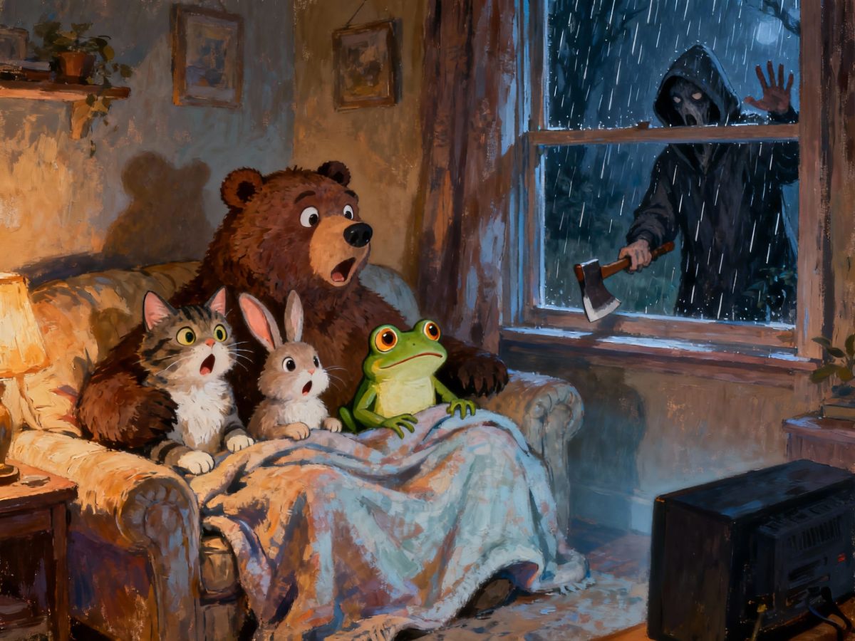 A bear, a cat, a rabbit and a frog, crowded together on a comfy sofa with a blanket, watching movies at night, when a creepy hooded figure standing outside in the rain, taps the closed window with an axe. Wide eyed startled expressions, exaggerated fear, cute, funny, painterly