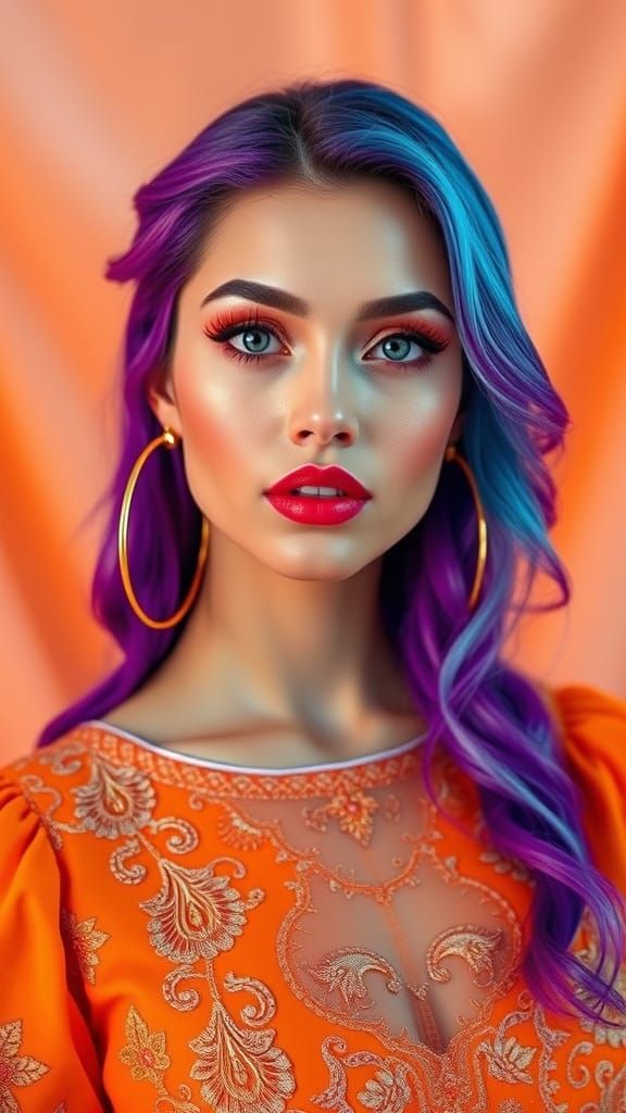 This image is a stunning portrait of a woman with vibrant, ombre hair and bold makeup, set against a soft, pastel background in a hyperrealistic style reminiscent of digital art and glamour aesthetics.