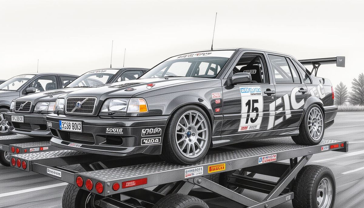 This image features multiple hyper-realistic Volvo 850 T5 cars with racing wraps, depicted as a detailed charcoal drawing. The artwork captures the intensity of a race track.