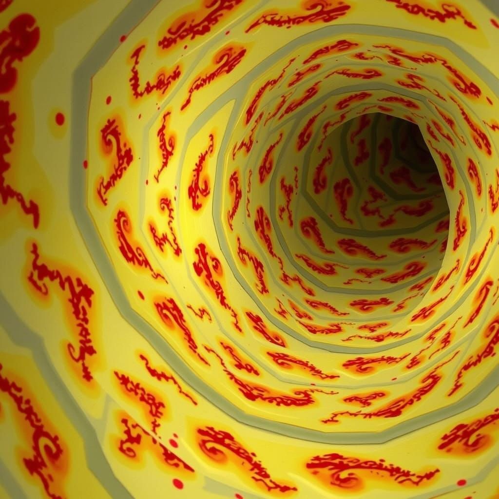 This AI-generated image depicts a surreal landscape featuring a blue sky, green fields, red lands, pink skin tones, and golden leaves bathed in white light.