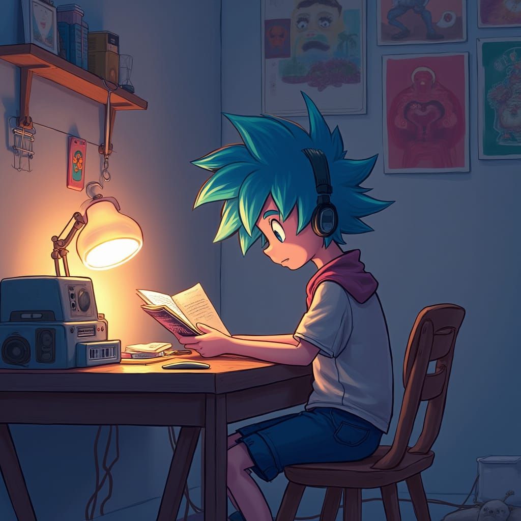 This image shows a teenage boy with spiky blue hair, sitting in a warm and cozy bedroom surrounded by nostalgic decor, reading a book and listening to music through headphones under soft pastel tones and gentle ambient lighting, in a whimsical digital art style.