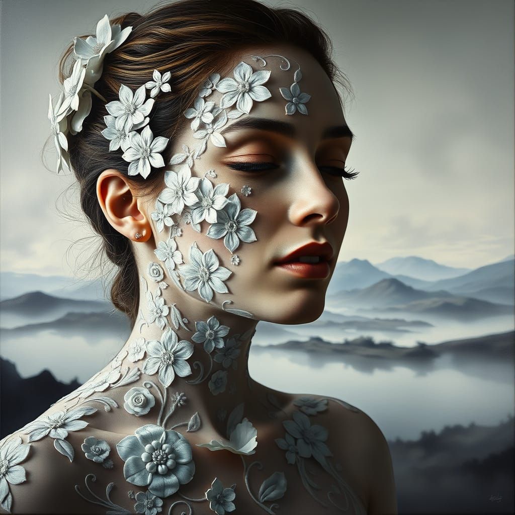 This oil on canvas painting features a woman with intricate, 3D floral patterns on her face and body, rendered with chiaroscuro lighting and a distant landscape in the style of Caspar David Friedrich.