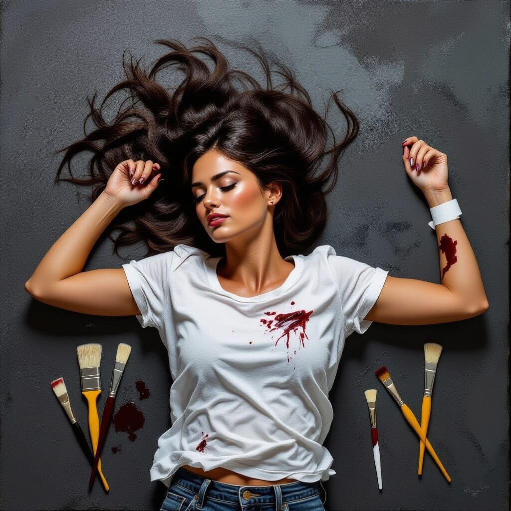 This image shows a woman lying on a textured surface, her body angled diagonally. The artwork features aggressive impasto brushstrokes in muted tones, conveying emotional exhaustion and fatigue.