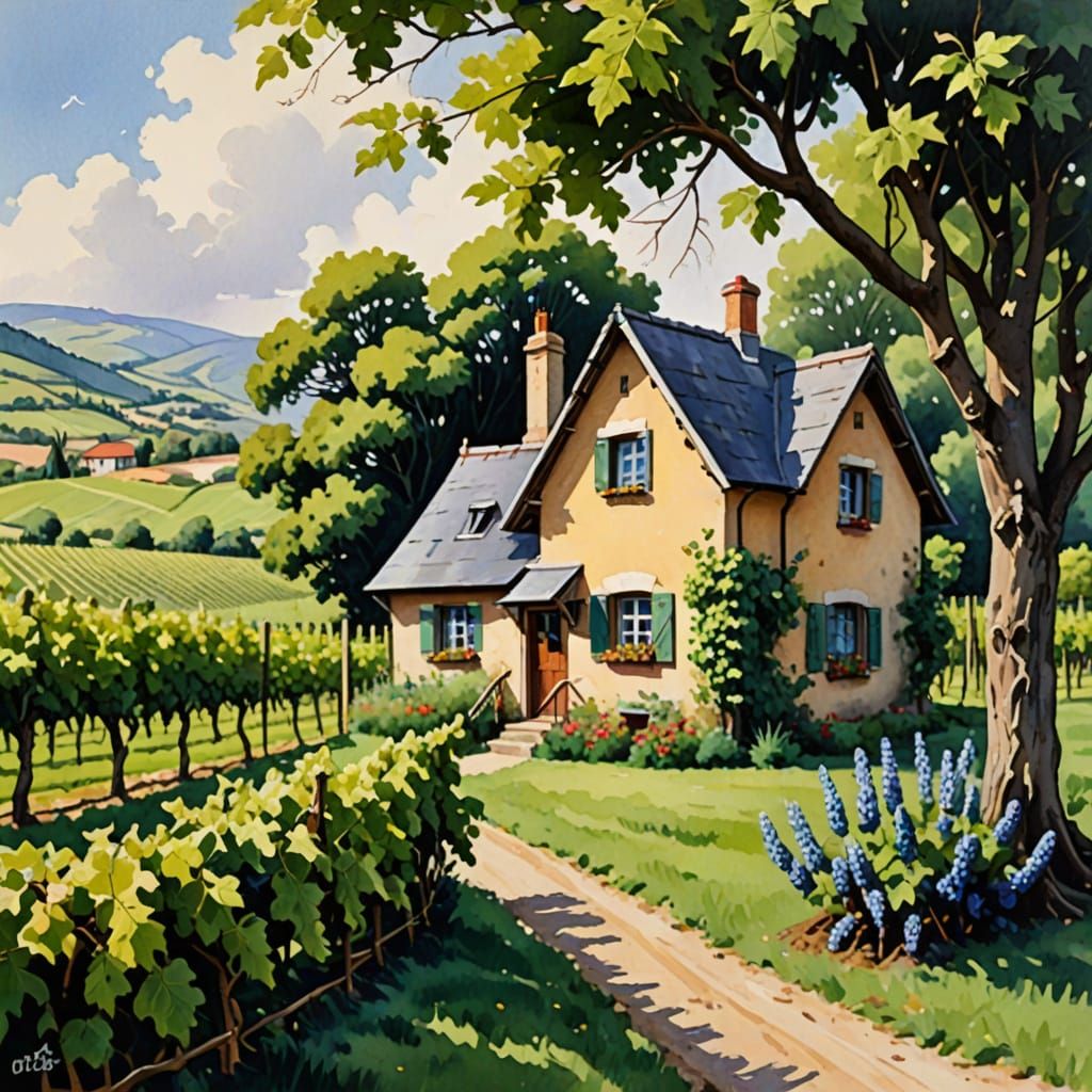 This gouache painting depicts a quaint, small cottage nestled in a lush vineyard setting, with vivid colors and detailed brushstrokes bringing the scene to life.