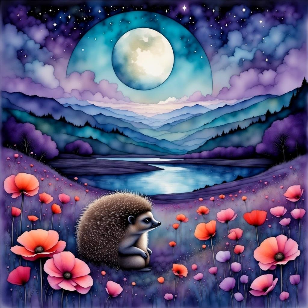 This image shows a serene hedgehog amidst a field of poppies under a huge full moon, with a beautiful blend of deep blues, plums, aquas, whites, and golds in a painterly watercolor style