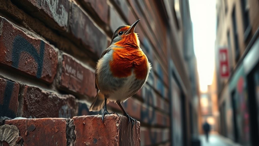This image shows a robin singing from a graffiti-covered wall in a city alley. The hyperrealistic image is lit dramatically, highlighting the bird's red breast, with a cinematic and atmospheric style.